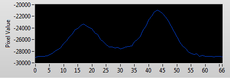 The beam has a roughly doughnut-shape, which is determined by the shape of the neon moderator (the moderator has a hollow centre, and so there are fewer of the slow positrons that we detect in the centre of the beam). This beam structure is highlighted in the following figure which shows the recorded beam intensity along a line (shown in the above figure).
