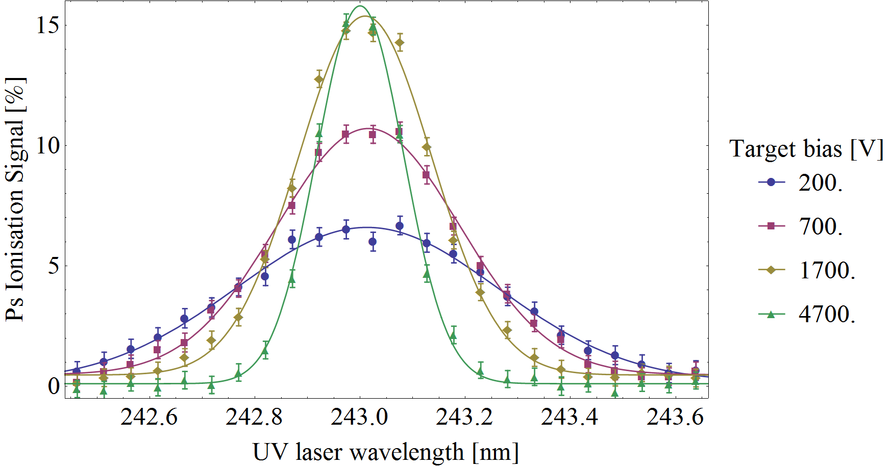 The different coloured points represent different voltages applied to the Ps converter. This voltage creates an electric field that attracts and accelerates the positrons, implanting them into the material. The highest target bias has the narrowest RIS line-shape as the Ps atoms form deep inside the sample and therefore experience more collisions as they make their way back to the surface, which slows them down and reduces the Doppler effect.