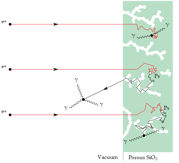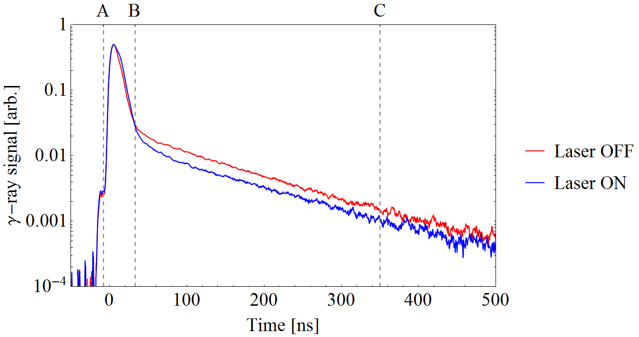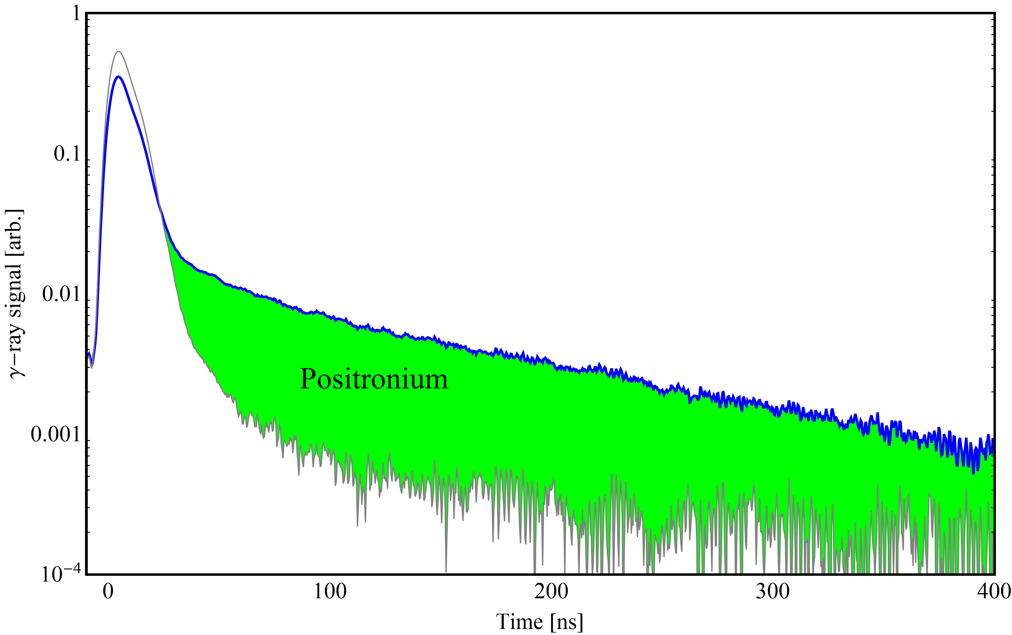 The positrons are very likely to fall back into the target and annihilate shortly after ionisation occurs, causing more gamma rays to be detected during the prompt peak of our SSPALS traces; with fewer o-Ps annihilations subsequently detected at later times. An example SSPALS trace, with and without the laser, is shown below.