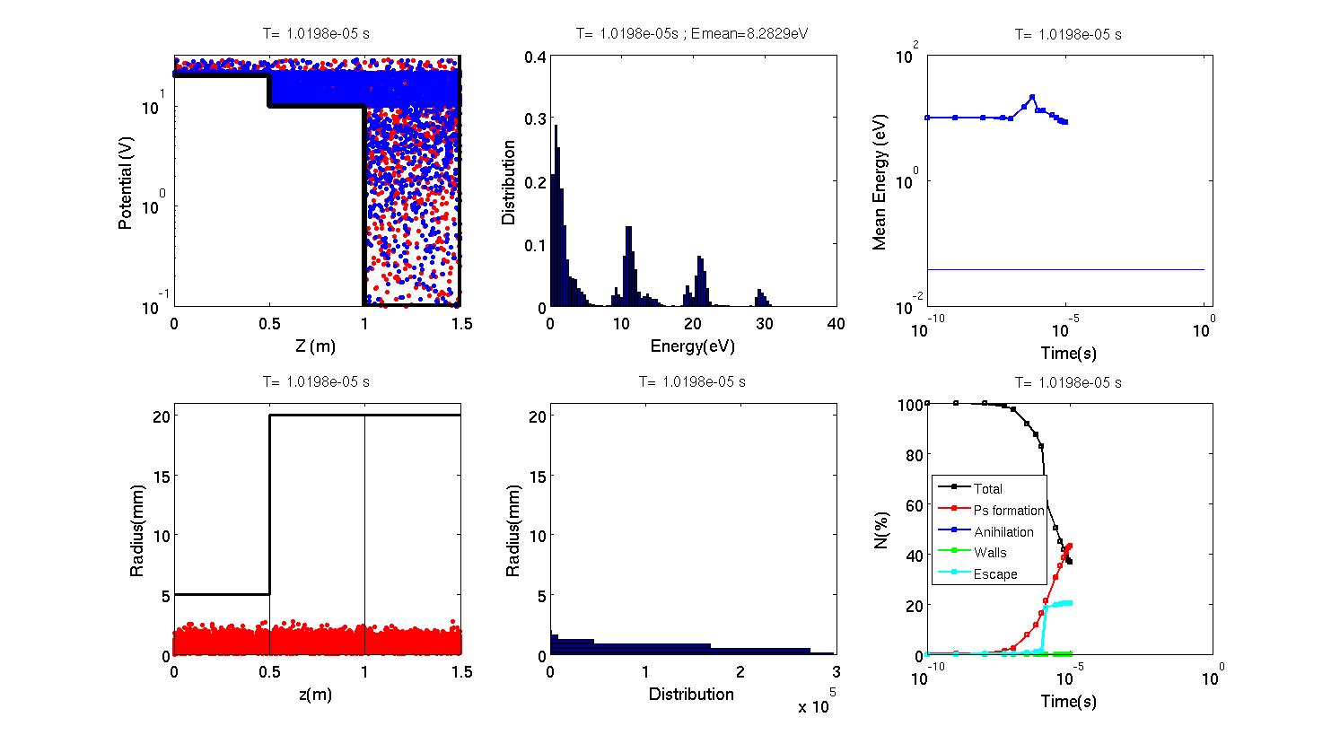 This past week Srdjan Marjanovic, a PhD student at the University of Belgrade, visited UCL to test some of the simulations he has been working on (see above) using our positron trap. One suggestion he made is to use CF4 for trapping, in lieu of nitrogen, the logic being that for the energies where inelastic collisions dominate many loss mechanisms are suppressed. The main difficulty, however, is that many more collisions are needed to successfully capture the positrons, as the energy exchanged to excite vibrational transitions in CF4 is roughly 40 times less than for the electronic transition usually exploited with N2. Unfortunately we were unable to adapt our trap to work efficiently with CF4. Nonetheless, by trying we have learnt more about how our trap works and – most importantly – Srdjan has new data he can use to refine his simulations.