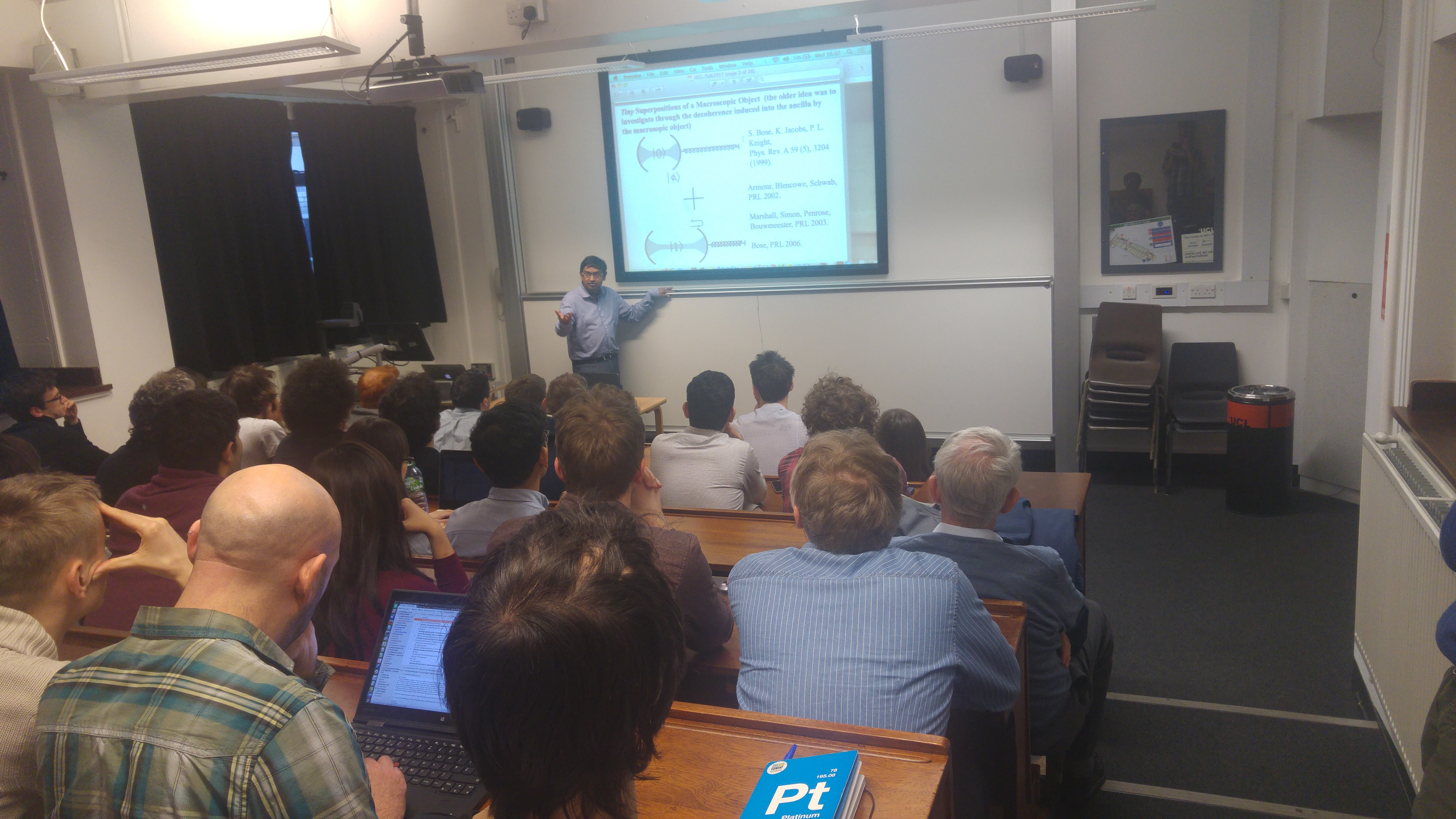 We often have internal speakers giving talks at the Atomic, Molecular Optical and Positron Physics (AMOPP) group about their cutting-edge research. Last wednesday (15th February 2017) Professor Sugato Bose presented some of his latest results and calculations based on experiments being performed by Professor Peter Barker’s group on macroscopic quantum behaviour.