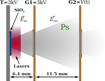 The set-up for this experiment is shown below where the target (T) holds a SiO2 film that produces Ps when positrons are implanted onto it. The first grid (G1) allows us to control the electric field in the laser excitation region, and a second Grid (G2) with a varying voltage provides a well defined ionization region. An electric field is applied by either applying a constant voltage to Grid 2 as in the case of the static field configuration, or by ramping a potential on Grid 2 as in the case of the pulsed field configuration.