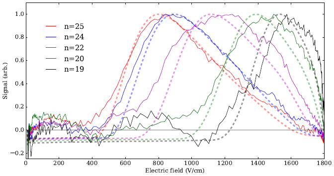 Below is a plot of our results with a comparison to simulations (dashed lines). We see broad agreement between simulation and experiment and, we are able to distinguish between different Rydberg states depending on where in time the ionization peak occurs. This means that we should be able to detect a change in an initially prepared Rydberg population due to some process such as microwave induced transitions.